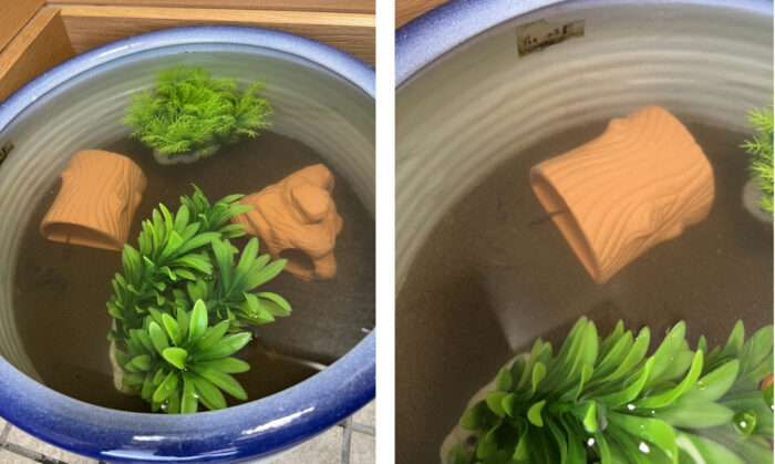 弊社のメダカは玄関の中に入れ、水草も人工のものに代えました。
