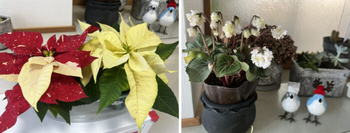クリスマスの雰囲気にピッタリなポインセチアとシクラメンを飾ってます。