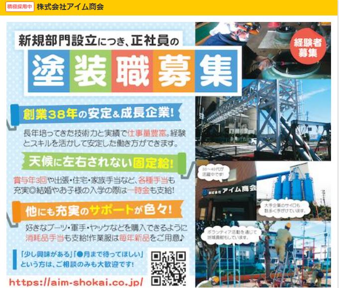 タウンワーク掲載スタート!新規部門設立「塗装職人」募集 2022年11月28日 本日からタウンワークに掲載スタートしました。 創業38年、はじめて「塗装職人」の正社員を募集します。 ㈱アイム商会に入社したら良いことを5つ集めてみました! ——————————————————- ①天候に左右されない安定の固定給 ②充実の手当と賞与年3回 ③同僚たちは温厚で人柄がよいので、すぐ馴染める ④抜群の定着率 ⑤小さな会社ながら制度はキチンと整っている 少しでも興味のある方は、上のタウンワーク写真をクリックしてくださいね。