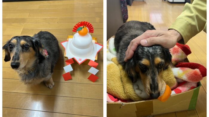 今年初登場ももちゃん🐶 2025年1月17日2025年1月10日 ももちゃん今年もがんばって出勤しております。 鏡餅に付いているミカンがボールに見えたのか気に入った様子! 従業員・お客様から可愛がられ出勤するのが楽しみで、 今年もパート並みに週4日は出勤しております。