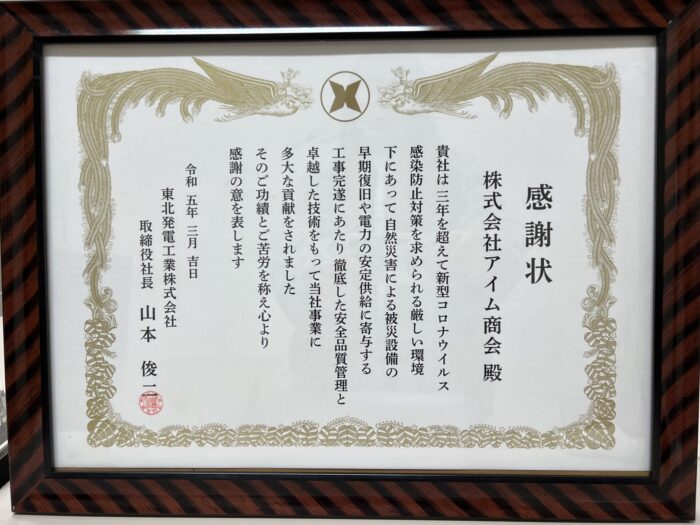 感謝状までいただけて、従業員一同、嬉しい限りです。