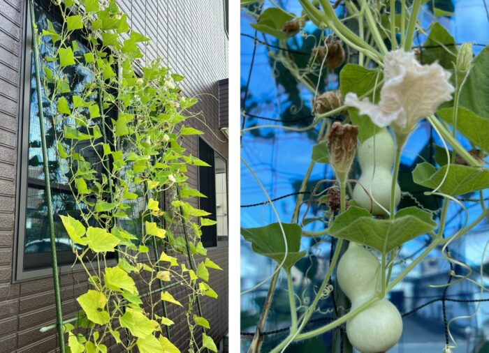 社内の窓から成長を眺めるのも、グリーンカーテンの醍醐味ですね。