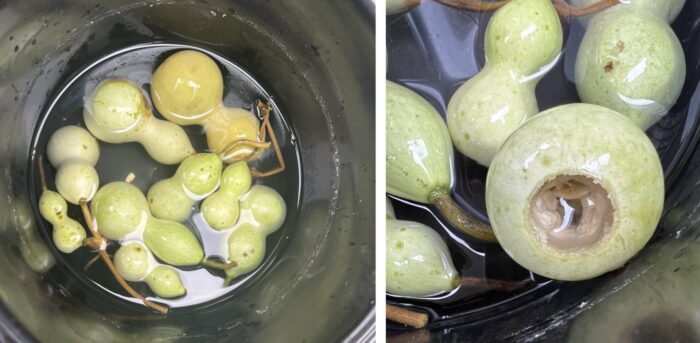 底に穴をあけ水に浸し、表面の薄皮と中身の種が出てくるのを待ちます。