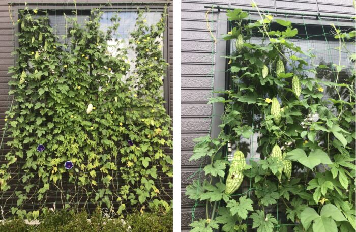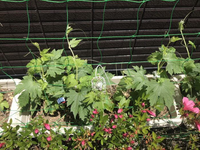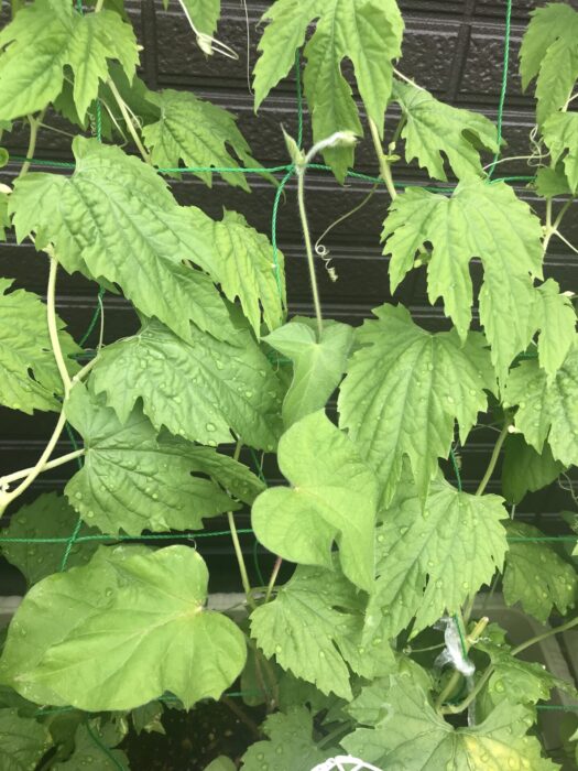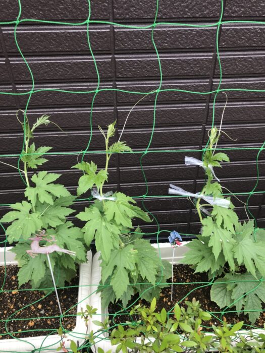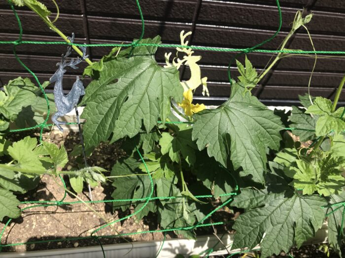 アサガオもゴーやの葉っぱの日陰になりつつ、負けずと頑張ってます。