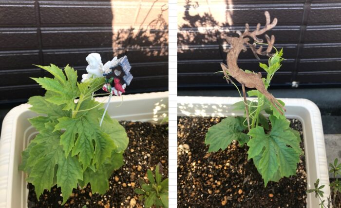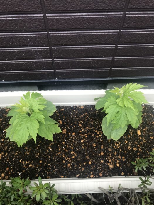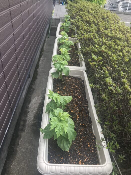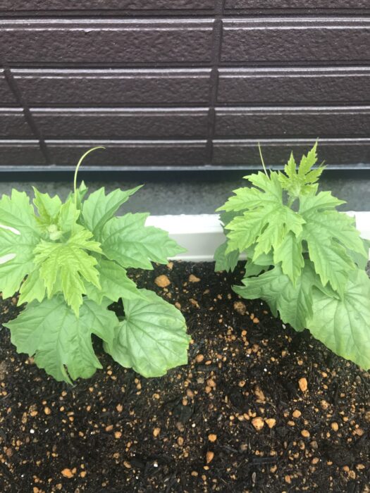 朝顔も間に植え、ちょうど三枚目の葉が出てきたところです。