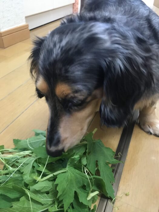 収穫したゴーヤを従業員と「モモちゃん」にもお裾分けしました。